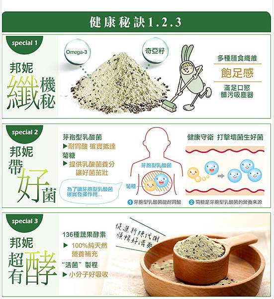 燕麥粉(含B-葡聚醣)、菊糖、有機小麥苗粉、