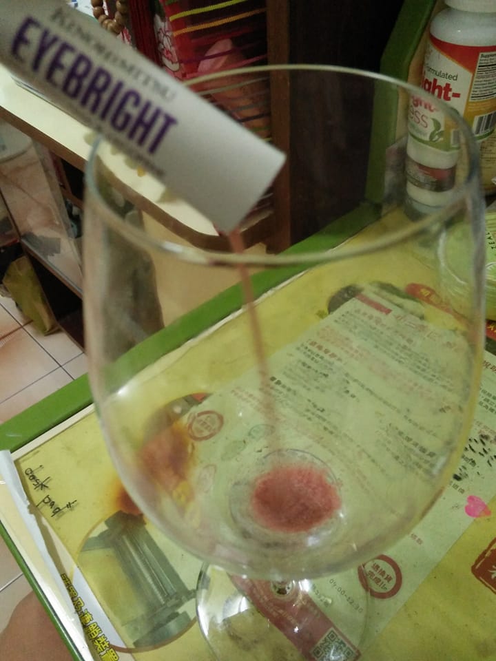 我示範一下用我家的紅酒杯喝一下, 它倒出後粉末是紅蘿蔔素的顏色,