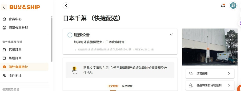 寄送的地址要填寫 Buy&Ship 日本倉庫