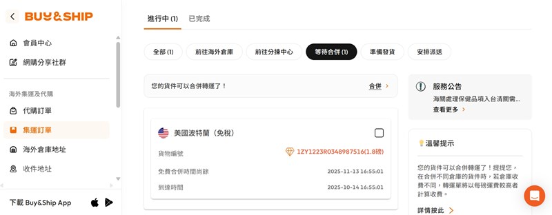 到等待合併這裡時,就能付款運費寄回台灣了~!