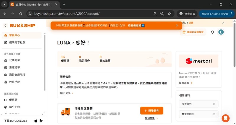 免費合併集貨 的方案,對像我這種會一次買好幾樣小東西的人來說超級划算!