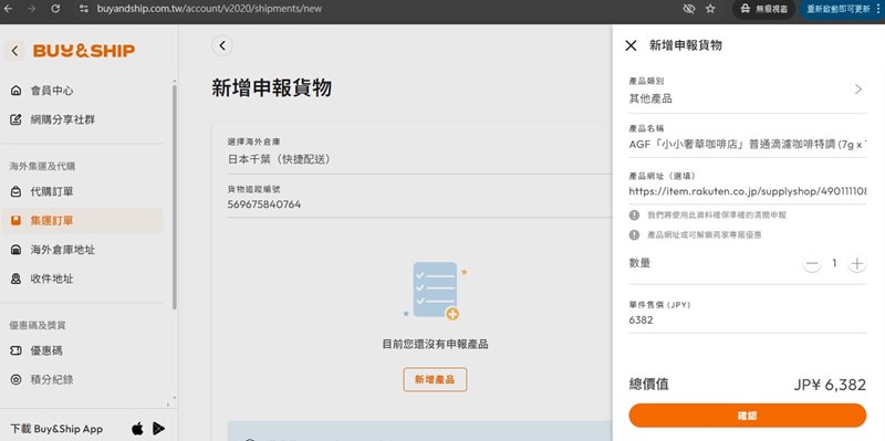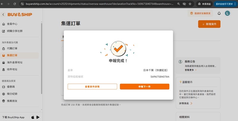 4️⃣ 賣家出貨後,我回到 Buy&Ship 網站,申報貨物內容。