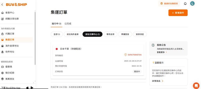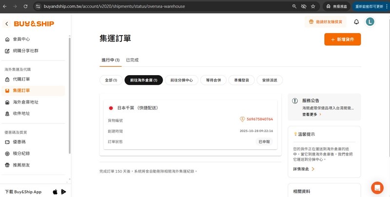 5️⃣ 貨到海外倉後,我選擇「合併集運」一次寄回台灣,超方便!