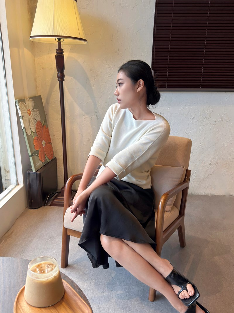 搭配緞面魚尾裙,再戴上細鍊或小巧耳環,整體簡約卻帶點高級感。