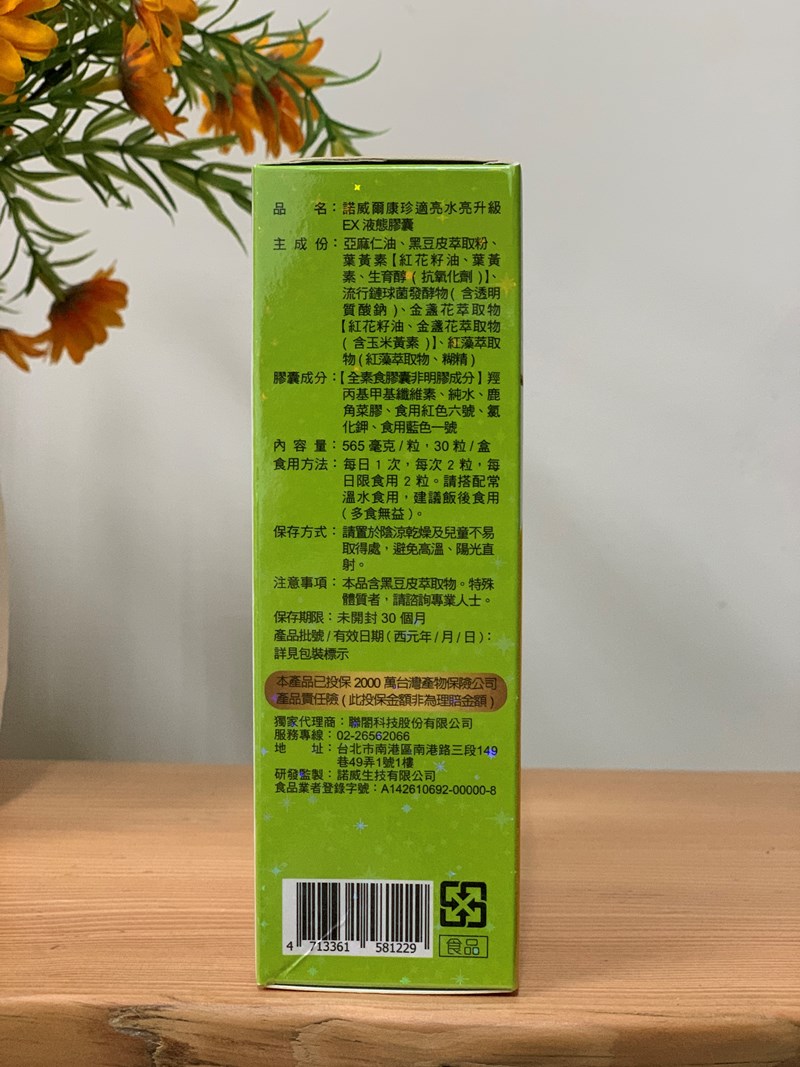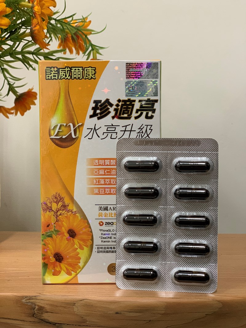 #諾威生技 諾威爾康 珍適亮水亮升級EX液態膠囊 #葉黃素及玉米黃素雙效更有感 #葉黃素搭配玉米黃素 10:2黃金比例 #採用液態型膠囊 #成分足量添加 #專業家醫科鄭高奇醫師代言好評 #添加2種純度高品質好專利原料 #FloraGLO #ZeaOne #美國原原廠授權於每盒有貼雷射商標 #專利ZeaOne® 游離型玉米黃 #美國 FDA-GRAS 官方認可的「金盞花天然玉米黃素」 #U.S. Patent No. 9,226,940保健的重要成分 #特別適合長時間使用電子產品的3C族群 #眾多美國專家好評的葉黃素 #80篇以上葉黃素研究報告實證 #美國FDA食品安全GRAS認證 #Kuromanin®專利黑豆皮 #富含黑豆多酚很高ORAC #促進新陳代謝 #FloraGLO® 游離型葉黃素 #幫助日常保健 #HAPLEX ® Plus 透明質酸鈉 #超過百篇發表及技術 #亞麻仁油(OMEGA-3) #紅藻萃取(富含蝦紅素)