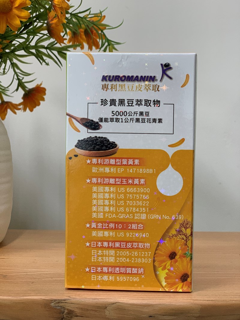 3. Kuromanin® 專利黑豆皮萃取物: 擁有日本專利,富含花青素-3-配醣體 (C3G),它的ORAC(抗氧化能力)值高達$16,000$單位,比起一般藍莓高出三倍以上,讓晶亮升級!
