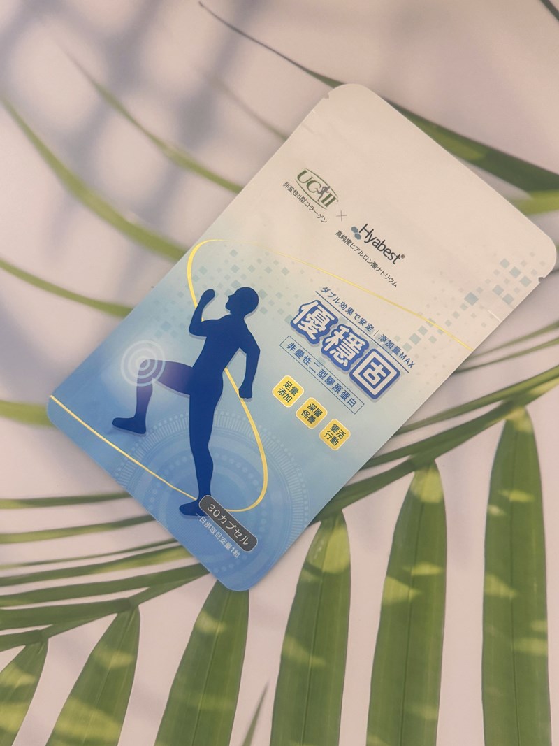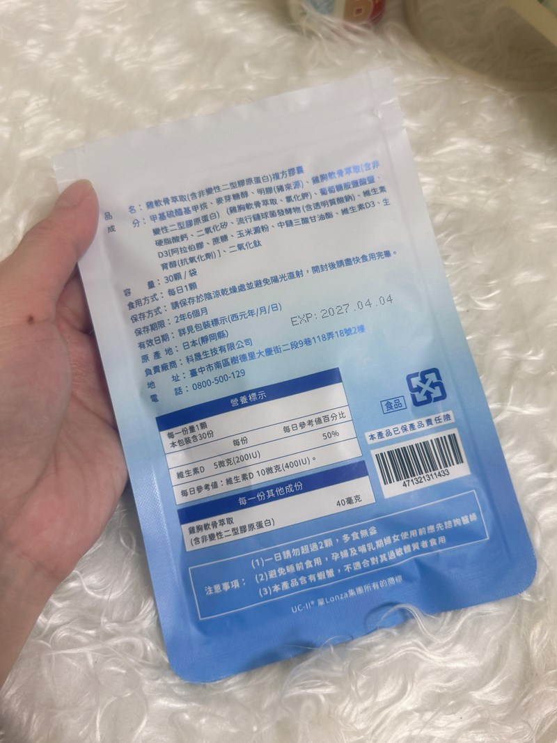 裡面含有高純度玻尿酸鈉、足量非變性二型膠原蛋白、維生素D、葡萄糖胺等營養成分,