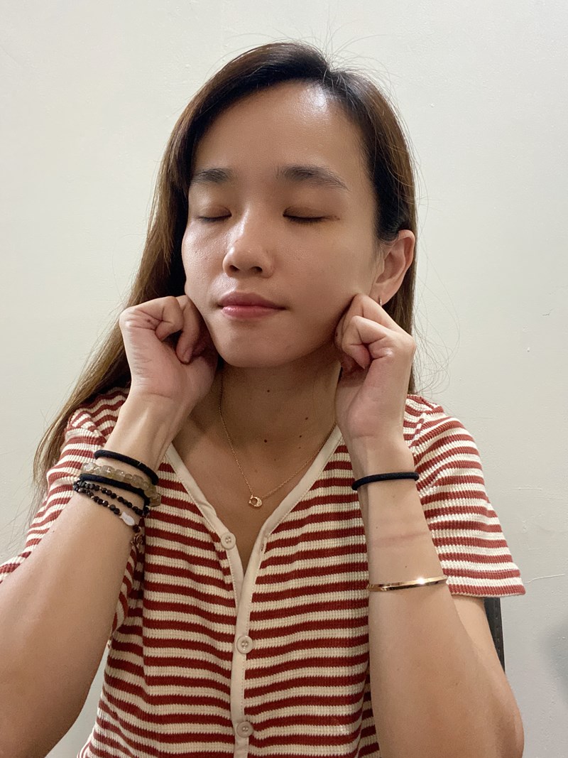 臉上先浮出一層淡淡光澤,但不是油亮,而是那種「皮膚喝飽水」的柔霧美。按摩一下下(可以加強按摩眼周、脖子等部位)就吸進去了。
