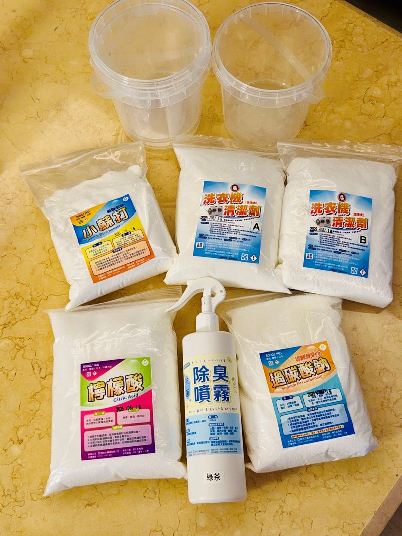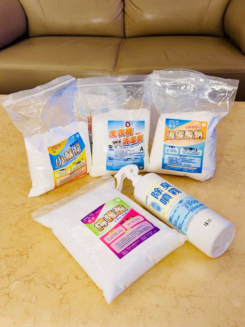 #化工小妹 #室內清潔5件組 #過碳酸鈉 #清除陳年頑垢 #清洗衣物 #去汙 #漂白 #要用溫熱水40度 #小蘇打 #碳酸氫鈉 #去除油垢 #比例1比30 #檸檬酸 #去污 #浴室清潔 #熱水壺等小家電去垢 #除臭噴霧 #防止異味 #鞋櫃 #廁所 #襪子 #洗衣機清潔劑 #除垢A+B #免拆洗衣機 #去除洗衣槽水垢