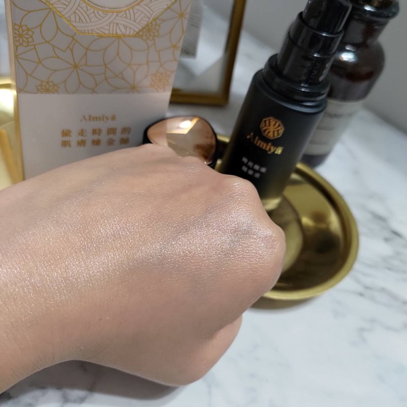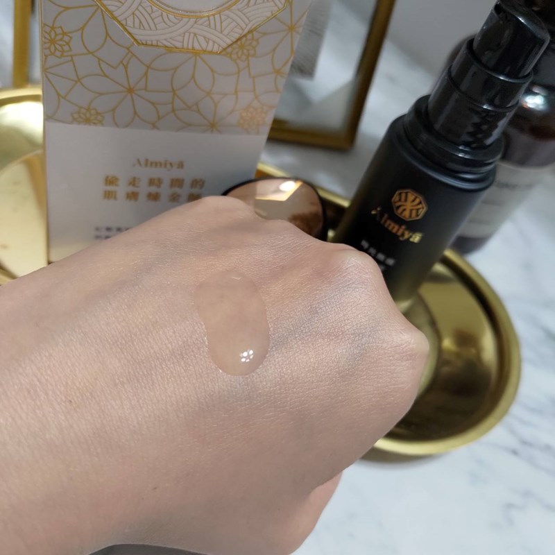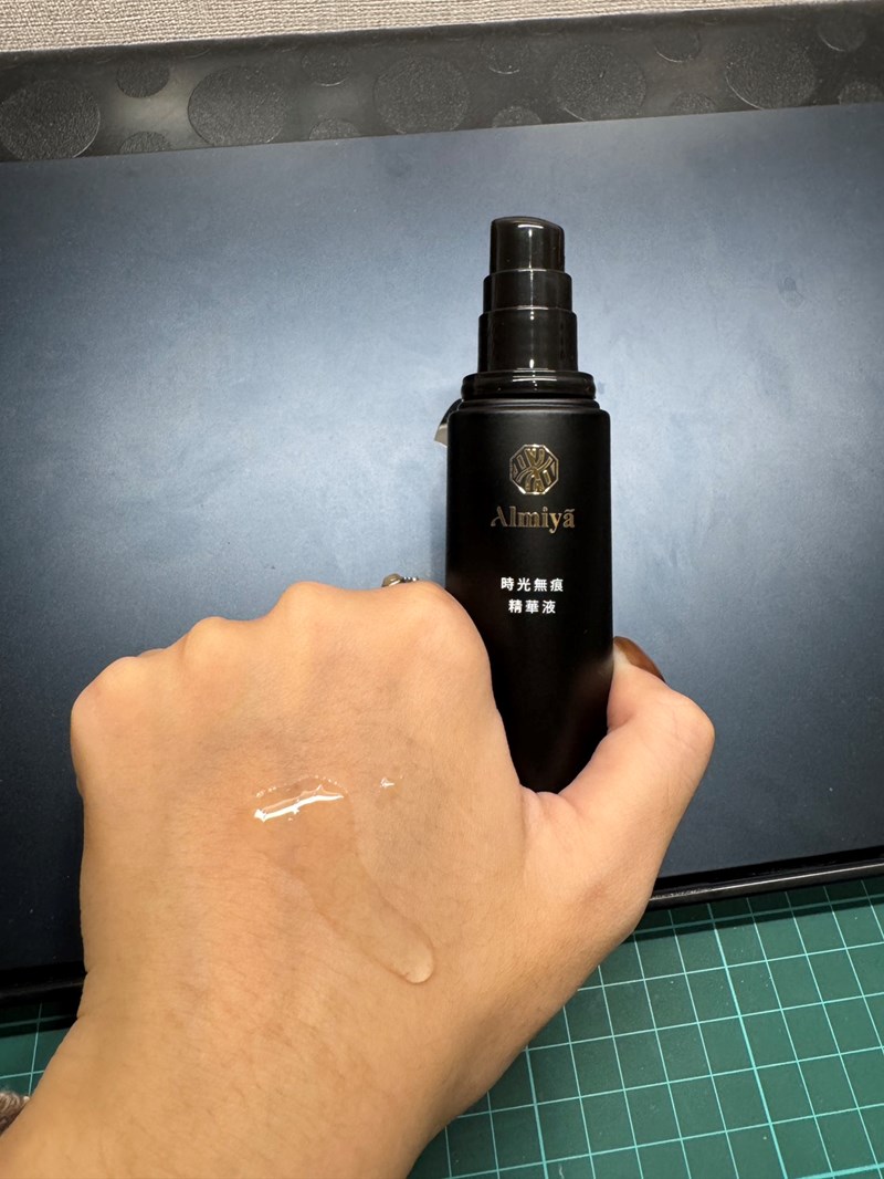 「Almiya 時光無痕精華液」是輕透的水精華質地,推開後馬上化成水感,