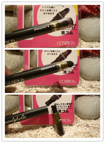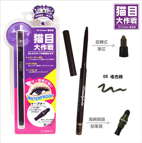 由台灣大廠COSMOS開發全程台灣製造,麻豆狂推熱銷上萬支,雙頭設計,一邊上色,另一邊附推棒可暈開為眼影。另在推頭還隱藏了削筆器,可削超細,適合畫內眼線