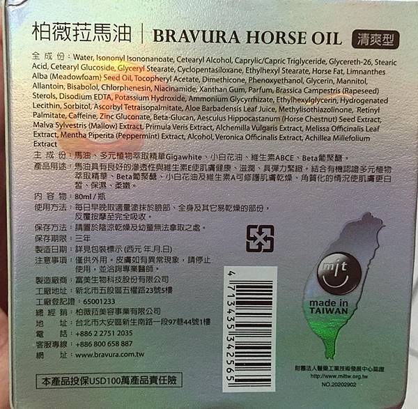 台灣廠商 Bravura柏薇菈 也使用日本進口馬油來製臉部保養品囉!!!!