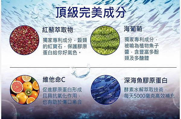主成份為紅藜萃取物,還添加了海葡萄專利成份/維他命C/深海魚膠原蛋白。等成份