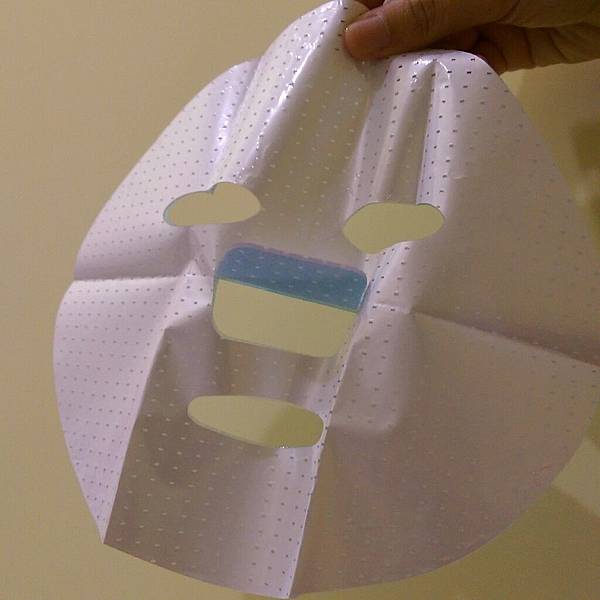 那我就來敷囉!先把白色的珠光膜撕下,白色藍色貼臉上,藍色朝外,調整好再把藍色那層撕下