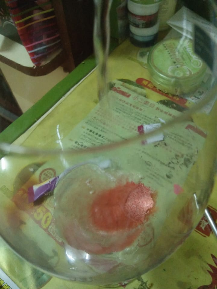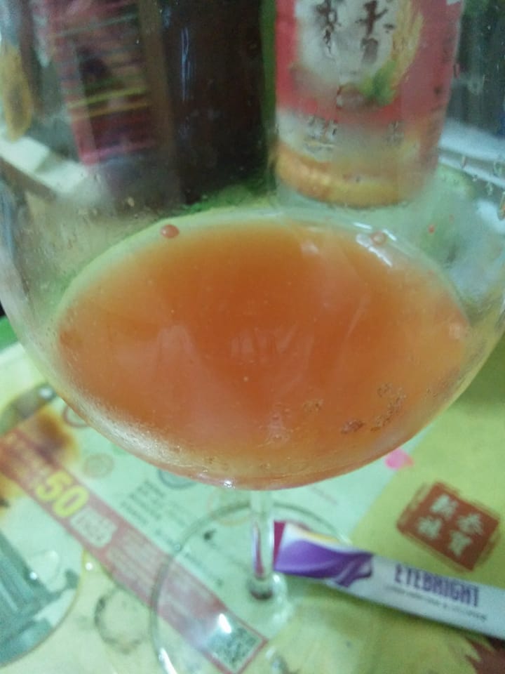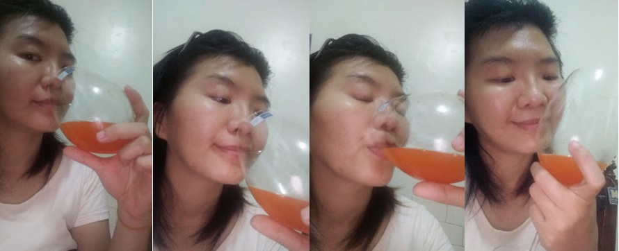 我示範一下用我家的紅酒杯喝一下, 它倒出後粉末是紅蘿蔔素的顏色,