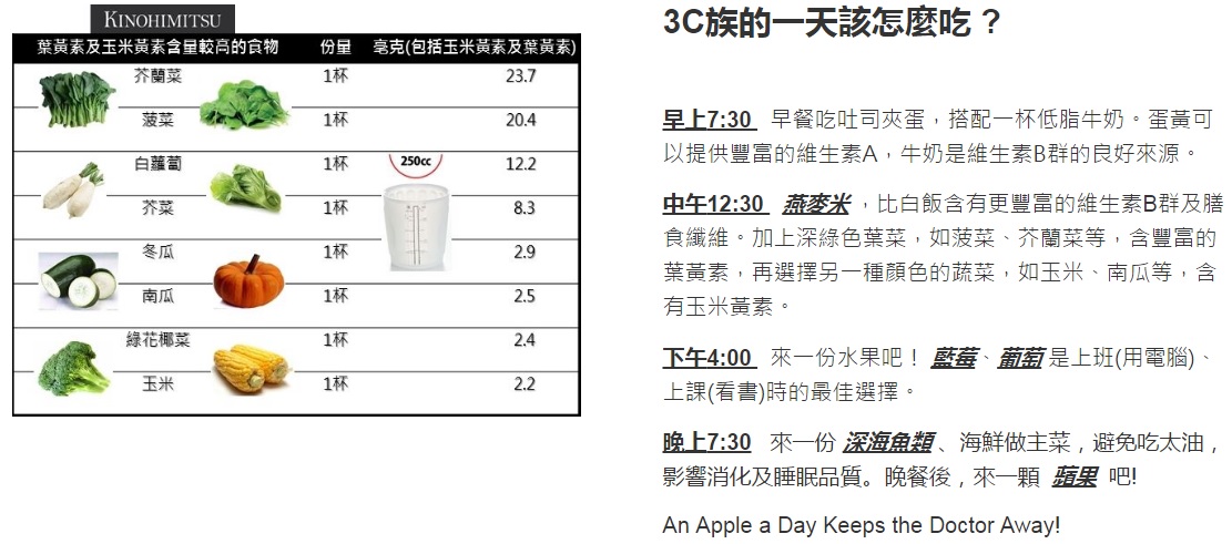 這是Kinohimitsu網站平日教大家保養眼睛的方法, 還顧及澱粉類.