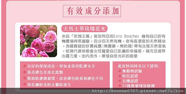 1.玫瑰精華選自大馬士革玫瑰水,來自高貴的英國所產的保加利亞農場的有機玫瑰。利用蒸餾的方式取得玫瑰水精華,無農藥也沒有防腐劑。經過各專業檢測~這是ENNY敏感型膚質最需要的也是最重要的一個環節~ 天然有機不含防腐劑,越天然越簡單則越好。玫瑰是女人的神奇花朵,上網搜尋了一下,發現通常含有玫瑰萃取的保養品都跟抗老撫平細紋有關~