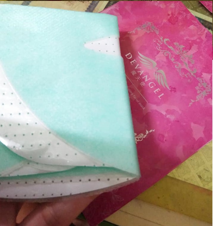 第三層是PP不織布材質(吸水材質)~撕開珠光後, 藍色PP材質朝外敷上面膜,