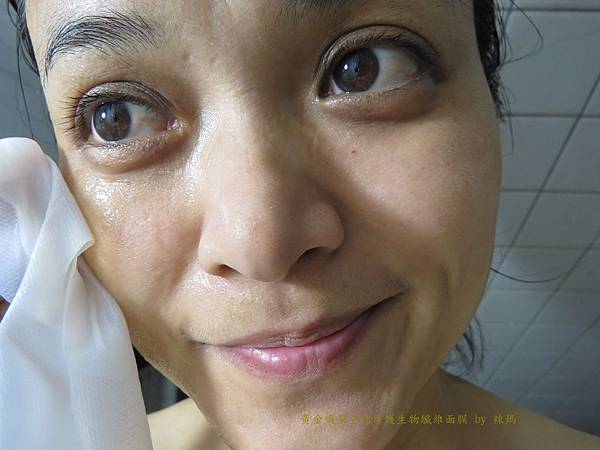 仔細看臉上有著生物纖維面膜 3D 立體交錯結構的烙印,可見它是多麼的服貼在臉上,