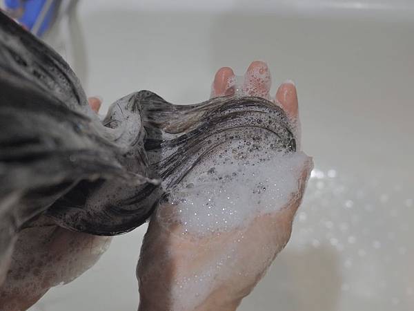 之後再塗抹到頭髮上,均勻搓揉。第一次使用的時候覺得很難起泡,重複使用到第二次終於能夠搓出泡泡來啦~