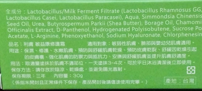 很開心這次女人知己試用大隊中獎試用的商品是利膚敏益康修護霜,是〝擦〞的益生菌成份溫和,寶寶也能用。內含專利雙球體微脂利結構;專利技術雙球體微脂粒。內層:五株舒敏益生菌;內脂質層:有機琉璃苣油、維他命E;外層:有機洋甘菊萃取、有機金盞花萃取尿素;外脂質層:乳油木果油、維他命B5,在肌膚上層釋放精華修護肌膚恢復健康穩定狀態。是機能性保養品,不是藥品