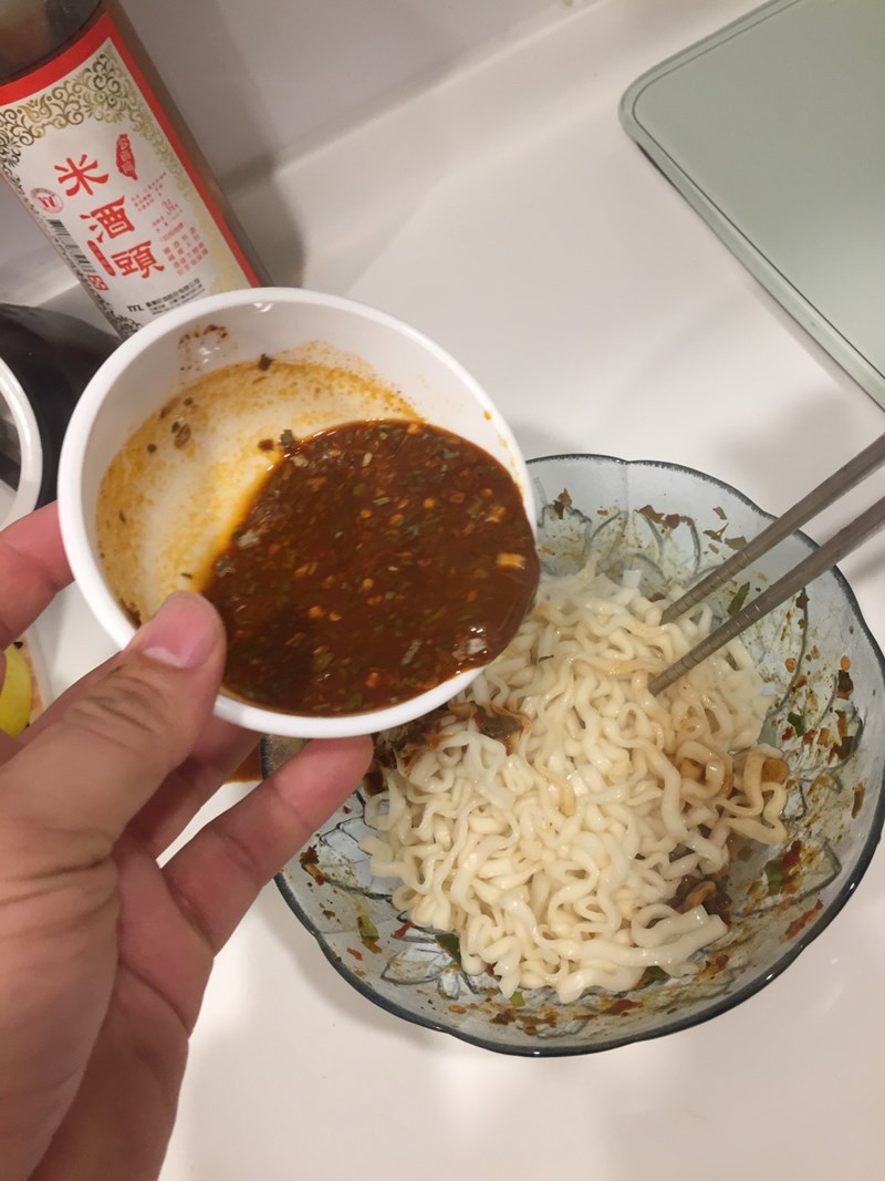 在等待的同時可以準備湯碗將醬包倒入加約20CC的水攪拌並加入香料包,大紅袍花椒的香氣和辣度完全都有呈現出來,之後將煮好的麵條撈起直接放入湯碗中攪拌,就可以吃囉。