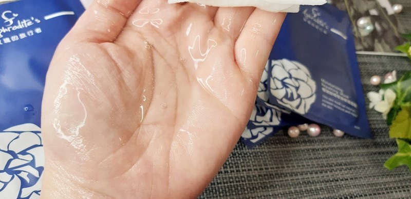 面膜當中的精華液質地偏向水狀,帶有微微的稠度。