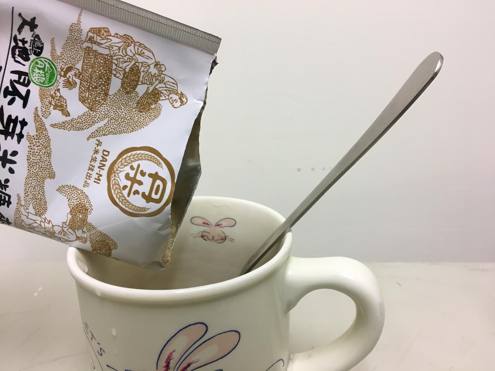 要製作出一盒池上大地有機胚芽米糠麩,大約需要用到3公斤糙米,才能取得足夠的營養精華,是不是很不可思議? 而每包採用精緻袋裝的池上大地有機胚芽米糠麩,約為20克重,攜帶很便利,且包裝上面都印製了製造日期及有效日期,即使外盒不慎遺失,也不會發生看到它,卻怕賞味期限已過而不敢吃的窘境。丹米米糠麩的吃法,很簡單,可以直接沖泡或是加入果汁、牛奶、豆漿等混合拌勻來食用。整包倒出來的量,約佔馬克杯1/4,粉質細緻,單獨聞起來有股樸實的香味。我個人喜歡麵茶稠稠的感覺,倒入足量的水,攪拌均勻,口味很單純,沒有人工香料味,口感不會有過度黏牙,滿適合單獨品嘗原味的。現在的人注重健康,會喝很多即溶的沖泡飲品,從堅果飲,到12種穀物,種類很豐富,而這款池上大地有機胚芽米糠麩,走的路線不一樣,很單純,又營養豐富,全素可食,推薦給喜愛天然無添加飲品的人兒哦。