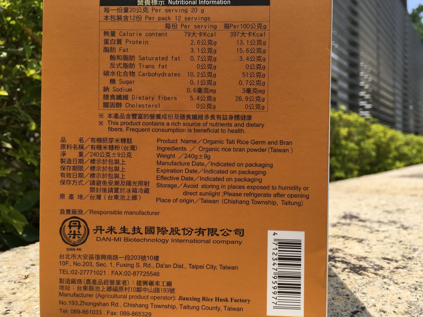 丹米生技的池上大地有機胚芽米糠麩的原料來自於台灣有名的米鄉台東池上鄉,並獲得台灣有機農產品及財團法人國際美育自然生態基金會MOA兩認證,在原料上就讓人安心。