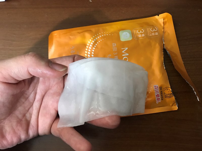 打開Moritek膠原蛋白緊緻光采面膜後可以看見的是白色的面膜體摺疊在不透光的包裝袋內,