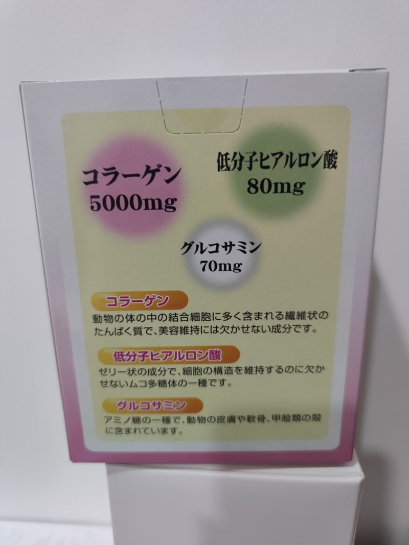 其中膠原蛋白含量5000mg、透明質酸鈉80mg、Glucosamine70mg、玻尿酸80mg,