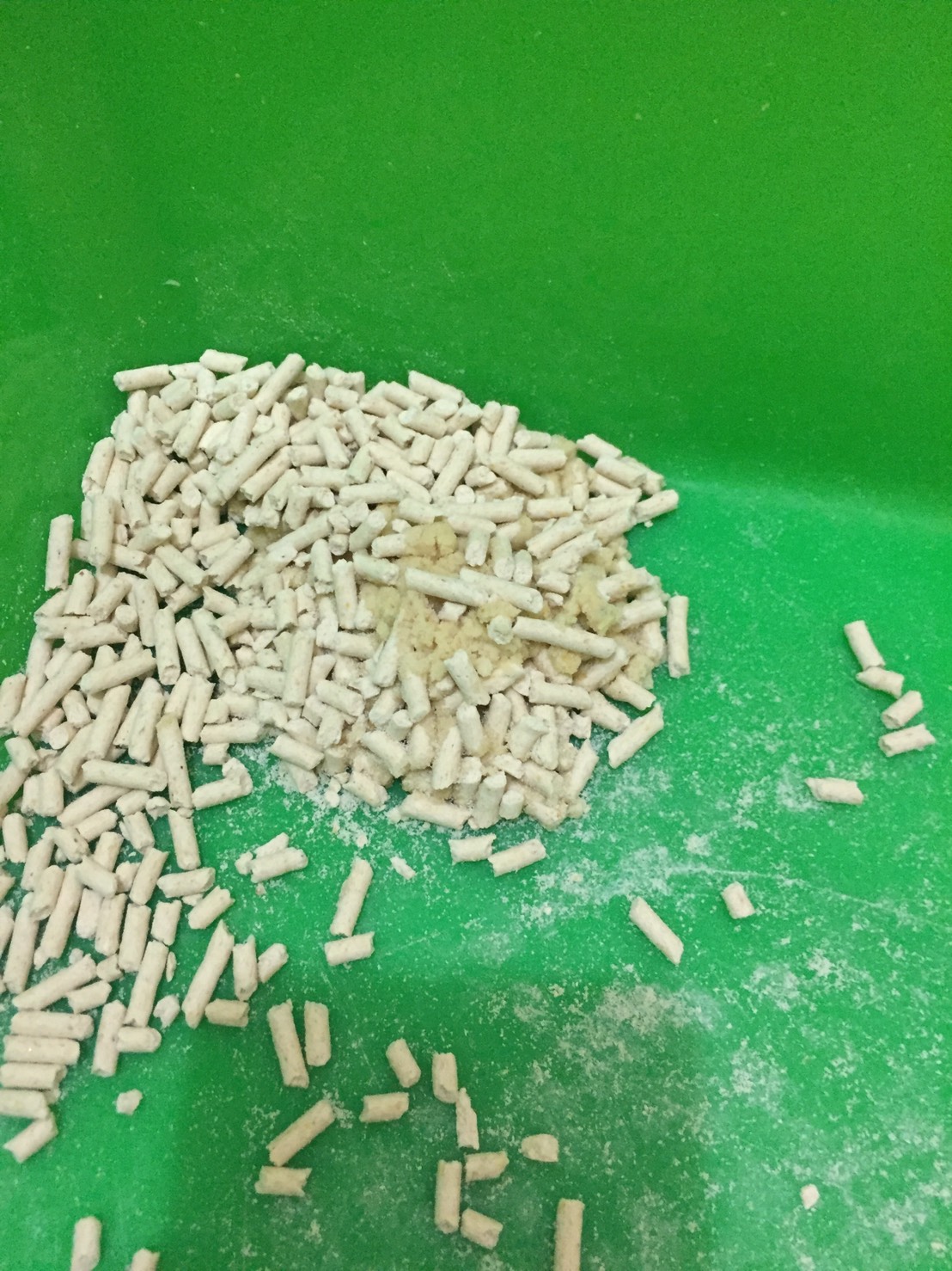 接下來就是把整包豆腐砂倒入。一開始使用比較短的公文林,後來發現太容易被撥出來,所以改用原本放崩解式木屑砂的貓砂盆,也不需要特別再去買單層的貓砂盆,直接把原本的雙層貓砂盆抽掉中間網格層即可,整個情況改善很多。