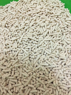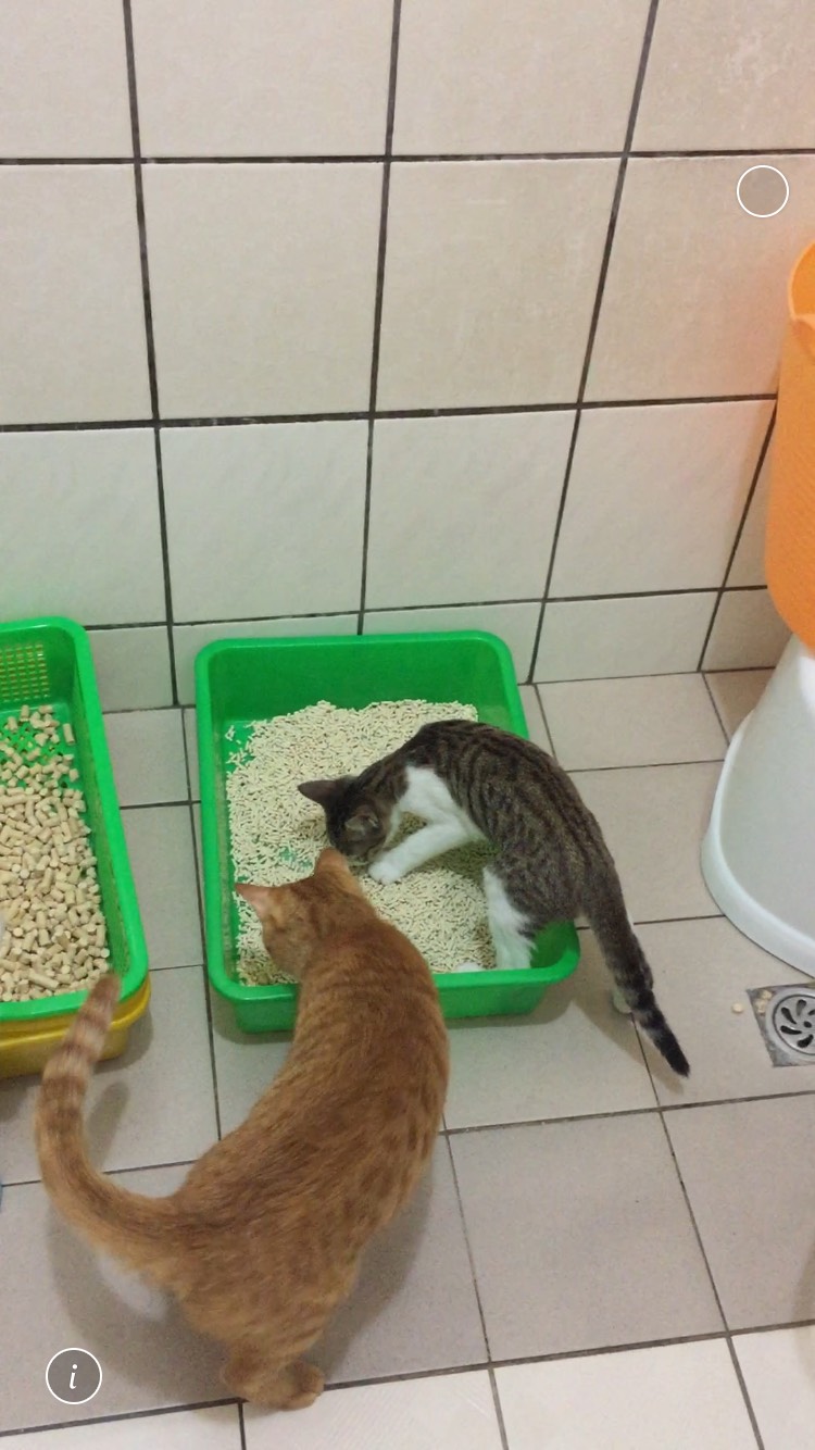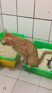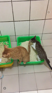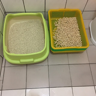 後來,貓主子偶而需要到拔拔家作客住上幾天,拔拔家不喜歡木屑沙直接沖馬桶,也不喜歡礦砂(因為會房間沙漠化),水晶沙踩到腳會痛,所以最後選擇豆腐沙,回到家裡又重新用崩解式木屑沙。但自從多領養了一隻貓之後,兩隻不知道為甚麼開始變成啦啦隊一族,崩解式木屑沙遇到啦啦隊變成非常難清理。於是奴才我便開始尋找好清理的沙。