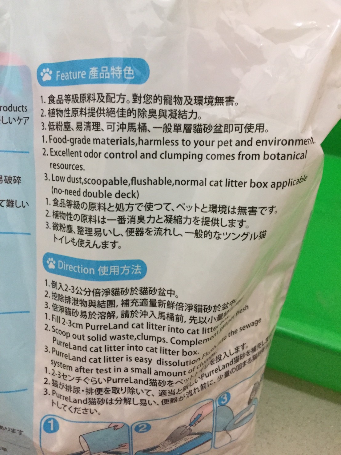 正巧這次PurreLand倍淨有試用機會,成分標榜由天然豆腐製成,是食品等級原料及配方,無添加漂白,對寵物及環境無害,低粉塵,除臭力強,凝結力佳,易清理,可沖馬桶,重量輕好搬運。不易攜出貓砂盆,居家環境更整潔。一般單層貓砂盆即可使用。味道有分成原味、綠茶兩種,這次拿到的是原味。