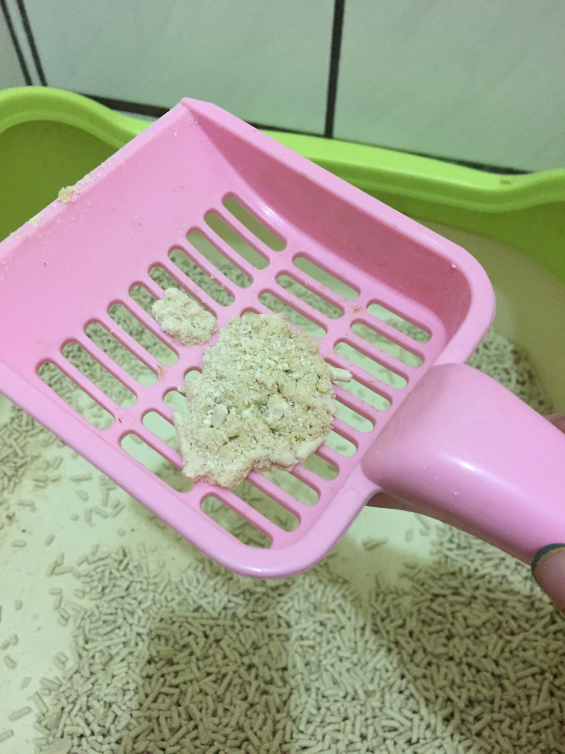 打從一開始貓主子就是用崩解式的木屑沙,清潔上很簡單,只需要用夾子把便便夾起來,底部的木屑粉衝入馬桶即可,用的也是很順,沒有出現貓主子不肯上廁所,亂便溺的問題。