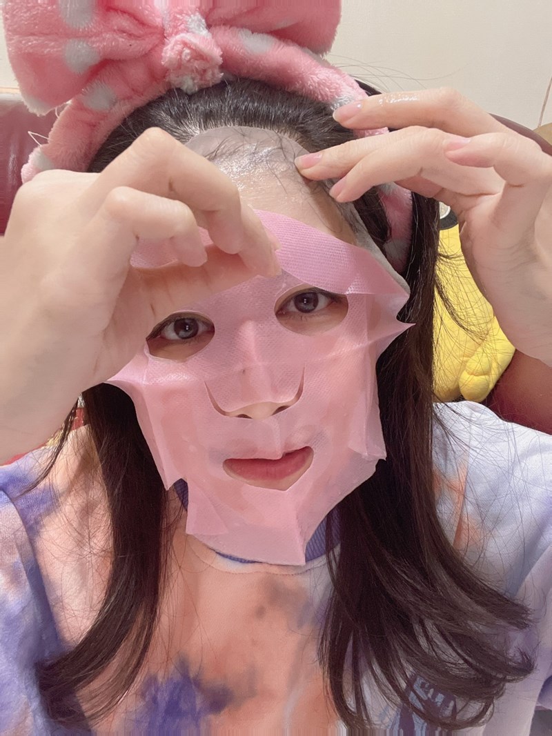 然後把粉紅色保護層朝外,然後把面膜貼合在臉上