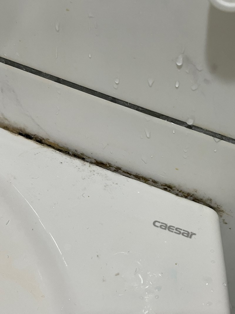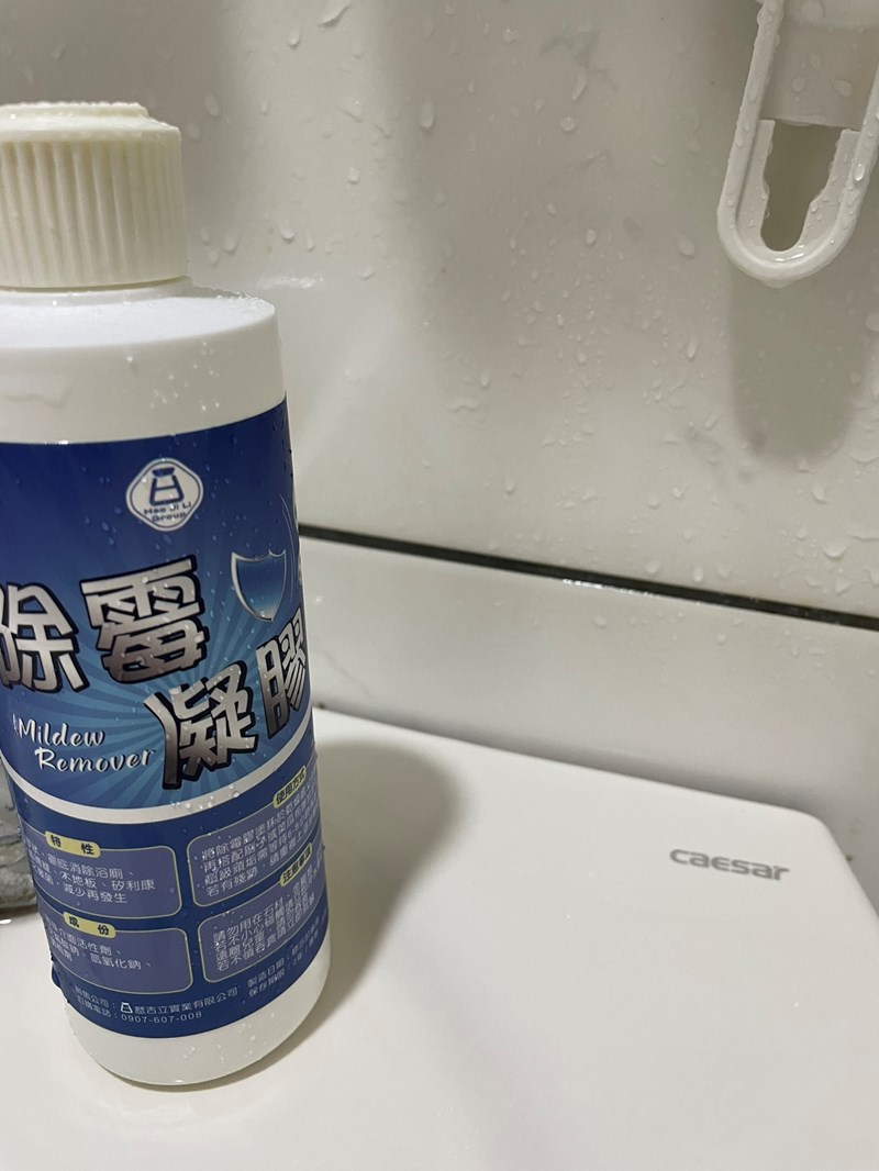 我們家這條縫塗過凝膠後靜置30分鐘左右,再用水沖洗或是用濕布擦掉霉斑輕鬆消失~