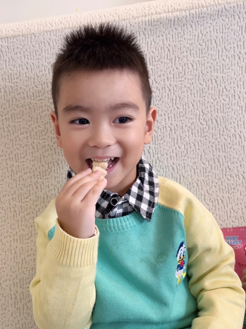 波浪造型讓他的小手比較好掌握,不會一下子塞太多,而是一口一口慢慢咀嚼。