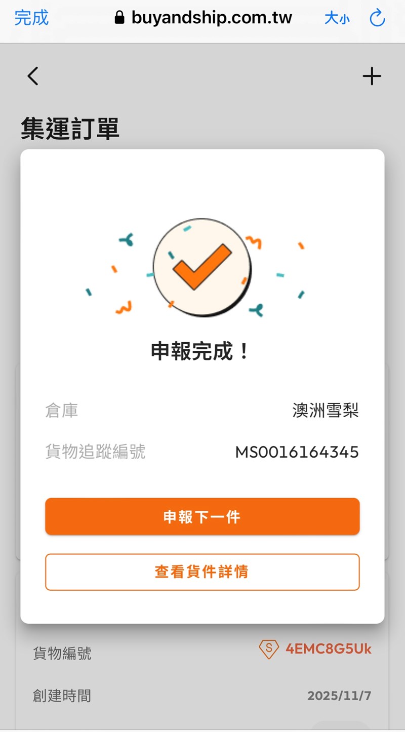 出貨後 複製包裹追蹤編號到buy&ship的平台新增申報貨物 再輸入當地國家的倉庫地址做下單
