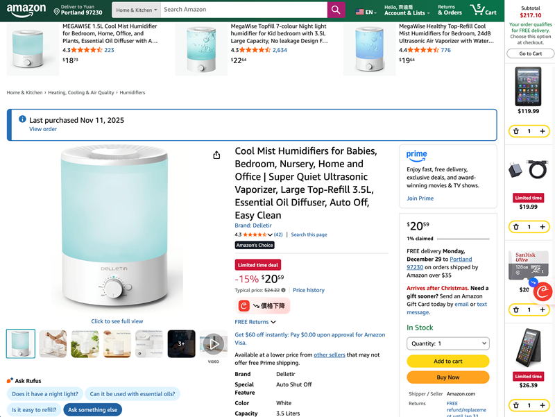 於是我開啟了 Amazon,想說看到之前有朋友推薦美國的加濕器還不錯,