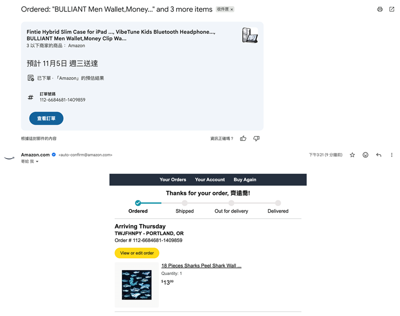 Amazon 出貨後你會收到訂單確認信,裡面會有: