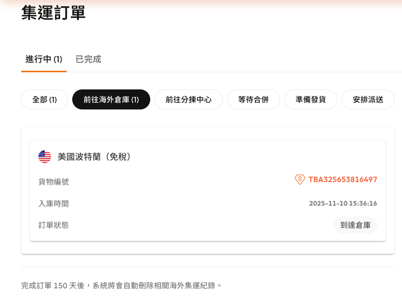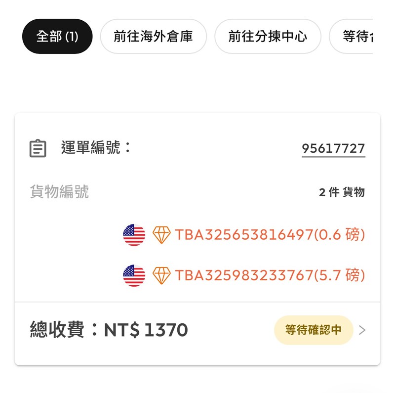 你截圖裡就出現了兩筆「TBA」追蹤號,代表 兩箱 / 兩筆包裹 分開到倉: