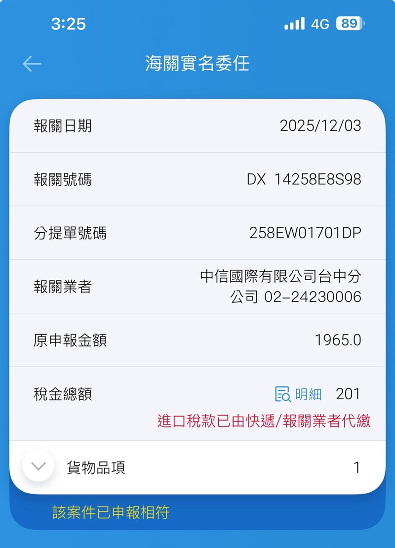 這次很順,因為狀態已經顯示申報相符&代繳完成,代表海關段落通過了。