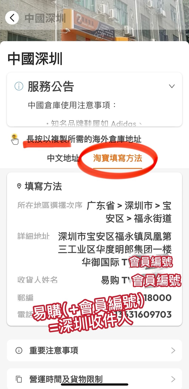 包裹填送到深圳代收集運倉庫,會以那組專屬會員編碼作為收件人而無須我本名,