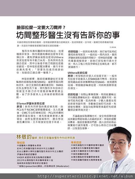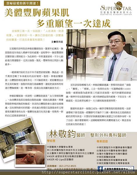 巨星整形外科專長隆乳、隆鼻、抽脂、削骨、自體脂肪隆乳、自體脂肪豐胸、果凍矽膠隆乳、蜜桃絨隆乳、威塑抽脂、威塑體雕、韓式隆鼻、自體脂肪豐頰、前額拉皮、拉皮、眼袋手術、雙眼皮、洢蓮絲、液態拉皮、Ulthera 極線音波拉皮、MiraDry, 腋淨爽、狐臭手術,強調客製化的「美感」服務,讓您享有巨星般的自信和美麗。台北首選_巨星整形醫學美容中心。