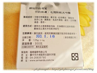 這次很謝謝[女人知己試用大隊]所提供的–清酒無限皂,讓我可以開心的使用天然香皂 這款使用日本最有名的清酒下去製造,外包裝也使用了超級可愛的熊貓來吸引目光 帶給我一種不一樣的視覺感官享受呢~ 香皂盒子的背面,也清楚的描細製造成份/使用方法/及注意事項 出廠日期為103.1.16(保存期限為二年到105.1.16) 淨重:約125g 台灣手作製造出產的,所以使用起來大可放心噢~ 因為呢~連製造商的地址.電話都寫得清清楚楚的! 還沒有打開紙盒裝,就聞到一股濃濃的香皂香 那是一種聞起來舒服又放鬆的味道,一點兒也不會覺得很刺鼻或聞了會頭暈之類的! 我很喜歡這種天然清香的味道,剩過於那些添加了些酒精芳香的味道 像這款清酒手工皂,還多了一股甜甜的清香味道出來,令我愛不釋鼻的聞 聽聞,日本人也很喜歡用使酒籽或酒粕類的添加來製造類似的美容聖品 拆開外包紙盒裝後,味道更是撲鼻而來 呈現亮亮的金黃色,其實搭成禮盒送人也很合宜 代表容光煥發、金光閃閃、好運金金來等..... 無限清酒皂的製造成份也很特別: 冷壓初榨橄欖油、椰子油、紅棕櫚油、酪梨油<據說對女性肌膚有保溼功用噢>、甜杏仁油<有美白效用>、篦麻油、乳油木果脂、鹼水、日本製清酒<含酒粕或酒籽成份>、香芬。 能不說它的產品很勵害嘛~女性缺乏的滋潤及美白的需求都有了耶~ 而這款台灣的在地好精神所製造出來的香皂,也不是一般市面上銷售大量的多! 手作香皂的好處在於,其實它使用量小卻帶來大大效用 而且,可以使用超級久的~加此清酒無限皂還有台灣獨家專利的低溫植粹,更是令人驚豔! 接著,開始來試用清酒無限皂的勵害了! 使用前,先放在我的手臂上,印鑑使用前我的肌膚是多麼的乾燥 而且,很明顯的一看我的毛細孔多麼的精大明顯吶! 使用方法:用水沾溼並搓揉起泡後,於身體部位塗抹並清潔動作,另外再以清水沖洗乾淨即可 其實我真的只用一點點的清水就輕易的搓揉出這麼多細緻的泡泡,而且也不會感覺澀澀的! 接著再以清水沖洗乾淨,也不必浪費很多水,一沖即淨,而且邊沖洗還邊散發出香皂的淡淡甜味! 我的肌膚呈現淨白柔嫩感,重點是:非常的清爽,不會感覺膩膩的!真的很棒~ 使用後心得: 這款香皂的特色,著實呈現了深層清潔以及滋潤全身的肌膚的感覺,而且再加上日本製清酒皂:極佳的美白還有令我感覺到有種去角質效果 並且也達到深層洗淨的功效 且可抵抗黴菌,挺適合各種肌膚使用的! 這麼棒的產品,我一定要推薦給家人使用,比市面上的麗X或其它大牌的香皂還棒,而且聞香味道更持久! 我的BLOG推薦分享文: **************************************以上純屬個人使用心得,不見於適用每個人噢!***********************************