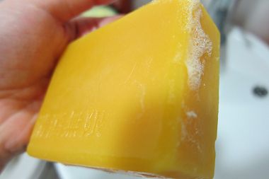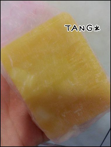 還有發現皂的上半截處多了一些白色小塊狀,及保鮮膜隨即變成了橘色,這使得充滿疑問與驚嚇的我,立即問了粉絲團的人,原來這個「白白的小塊狀物」,是另外製作的皂,主成分是冷壓椰子油為主,目的是增強洗淨力與美觀性。 而橘色其實是胡蘿蔔素黏在保鮮膜上面了,使用未精製紅棕櫚油,含大量胡蘿蔔素,所以看起來會是橘色的。判別天然胡蘿蔔素跟人工色素最簡便的方法,就是您可以將我們的清酒皂切一小塊,放在陽光下晒幾天,很快就會褪色成接近白色。這是因為天然胡蘿蔔素會被陽光分解,而人工色素不會。順道一提,我們之所以添加富含胡蘿蔔素的植物油,是因為胡蘿蔔素本身有很強的修復肌膚的效果喔~