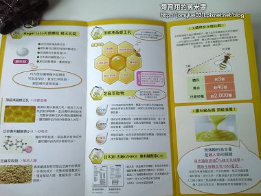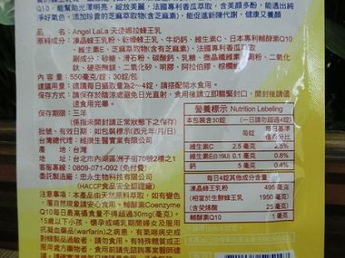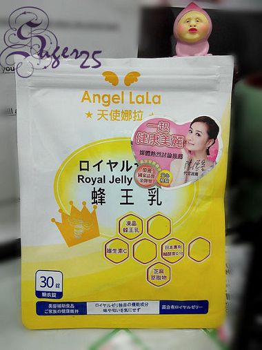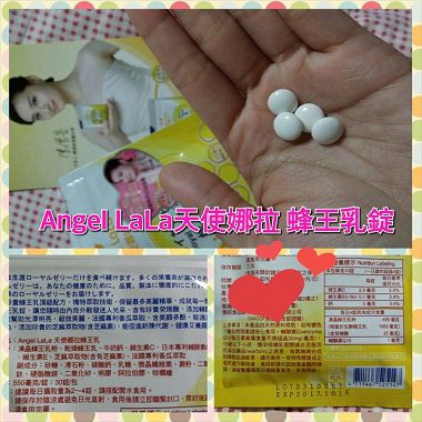 大家都知道蜂王乳是美容保養成分中的LV 這款Angel LaLa天使娜拉蜂王乳錠是陳德容代言的 美麗說達人也有推薦 很多女明星大力讚賞 裡頭含有晶蜂王乳粉、乾燥蜂王乳、日本專利輔酵素Q10、珍珠鈣、維生素C、芝麻萃取物(含有芝麻素)、法國專利香瓜萃取、維生素E