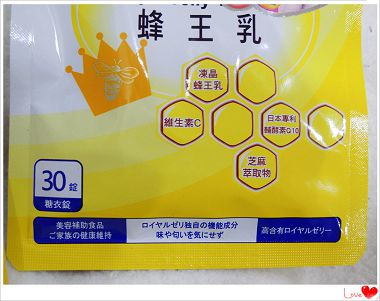 一包蜂王乳錠有30顆,外表是白色糖衣錠狀,含有40種以上的營養素, 而且一小包很方便攜帶,難怪女生們這麼追崇它不是沒有道理的XD