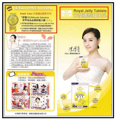由工蜂所分泌的蜂王乳,能夠供應一隻女王蜂一生的營養 所以在古代的"神農本草經"以及"本草綱目中" 蜂王乳都被列為珍貴稀有的藥材 現在也常被使用於各種頂級時捕獲者臉部保養品中 因為蜂王乳可以補充女性荷爾蒙,增強組織再生能力 順便跟親們說一件事,Angel lala的產品榮獲了雙獎肯定哦!! "2014Monde Selecton世界食品品質評鑑大賞-金獎" "SNQ國家品質肯定" 這讓用過許多Angel lala產品的丸子,更加肯定了這個品牌!!